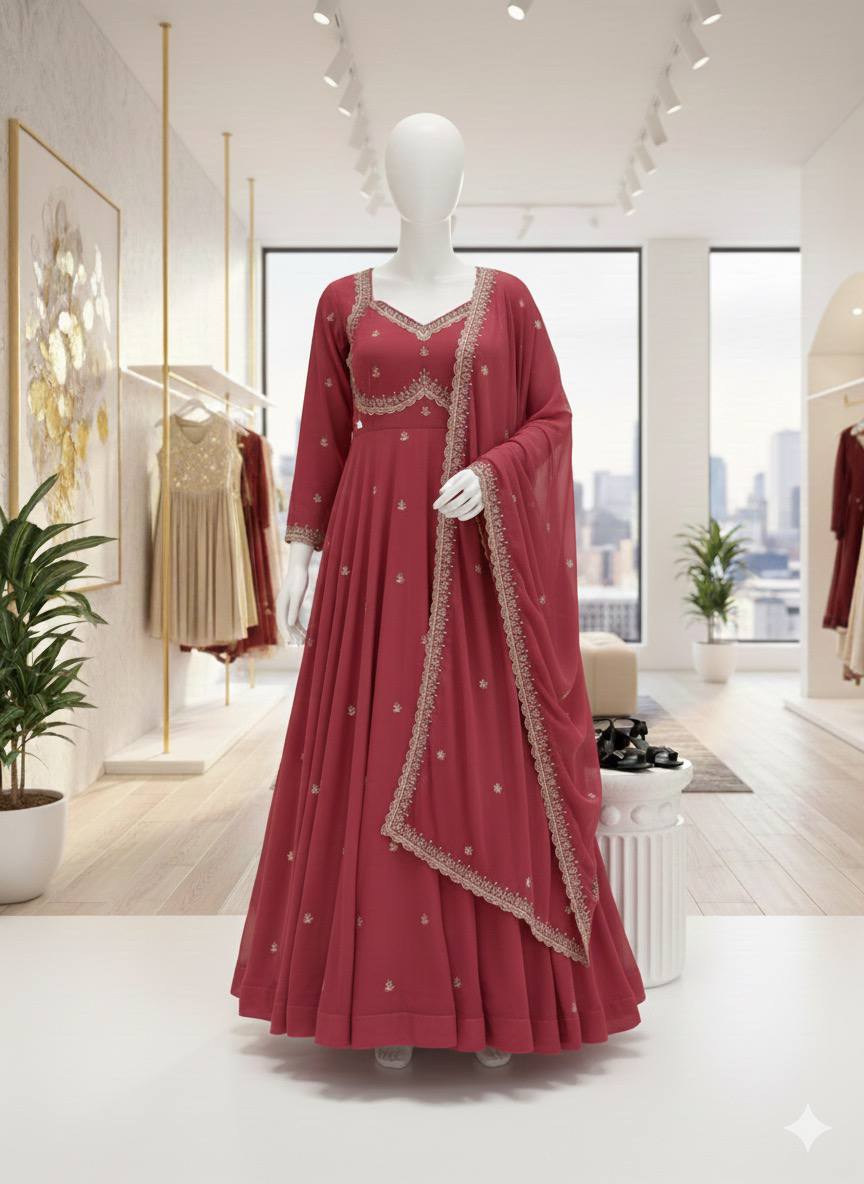 👗Gown Febrics Fox Georgette Heavy Quality Fabric With Rembo Sequence Embroidery Neck And Sleeve ,With Creap Pant , Duptta For Said Embroidery Sequence lace broder