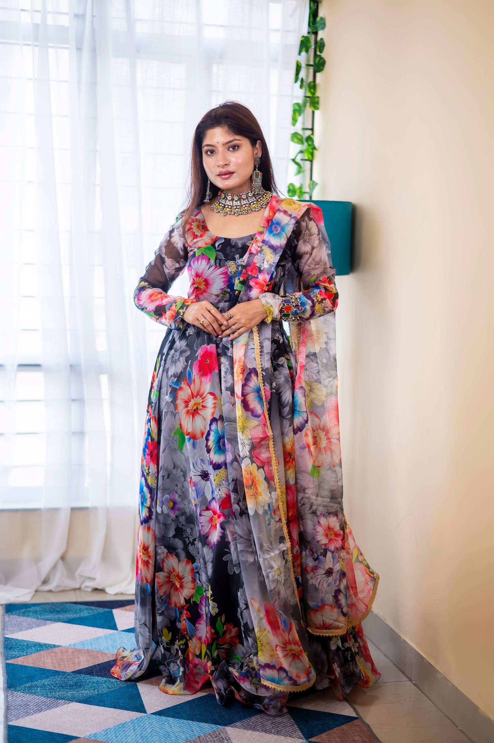 👗Gown Febrics Organza Soft Taby Silk Heavy Quality Fabric With Digital Print And , Full Long Sleeve ,